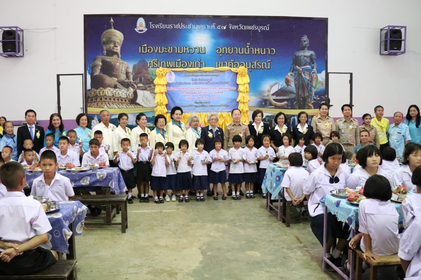 โดยการสนับสนุนจากโครงการสลากการกุศล ร่วมกับ จังหวัดเพชรบูรณ์ พร้อมด้วยหน่วยงาน องค์กรสมาชิก สภาสังคมสงเคราะห์ฯ ในจังหวัด ได้จัดกิจกรรมโครงการน้ำพระทัยพระราชทานส่วนภูมิภาค สภาสังคมสงเคราะห์ฯ 76 จังหวัด เพื่อเฉลิมพระเกียรติสมเด็จพระนางเจ้าสิริกิต์ พระบรมราชินีนาถ พระบรมราชชนนีพันปีหลวง ณ โรงเรียนราชประชานุเคราะห์ 57 จังหวัดเพชรบูรณ์ เนื่องในโอกาสเฉลิมพระชนมพรรษา 12 สิงหาคม 2562 โดยมีกิจกรรมต่างๆ ดังนี้ 1.มอบทุนการศึกษาแก่เด็กนักเรียน จำนวน 35 ทุน ทุนละ 1,000 บาท 2.จัดเลี้ยงอาหารกลางวันพระราชทาน 3.บริการตรวจสุขภาพ บริการตัดผม ให้กับนักเรียน โดยมีท่านพงษ์พิทยา ธนไกรศรีทอง รองผู้ว่าราชการจังหวัดเพชรบูรณ์ เป็นประธานในพิธี คณะผู้บริหาร คณะครู และนักเรียนโรงเรียนราชประชานุเคราะห์ 57 จังหวัดเพชรบูรณ์ให้การต้อนรับ